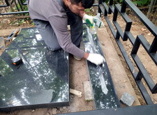В начале ставим основание надгробья, верхнюю сторону которого промазываем клеем.