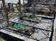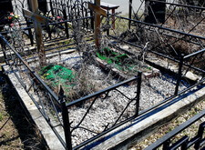 Ещё одна классическая уборка места захоронения. Отсыпанный крошкой участок замусорился, цветники поросли сорняком, металлическая оградка и кресты запылились.